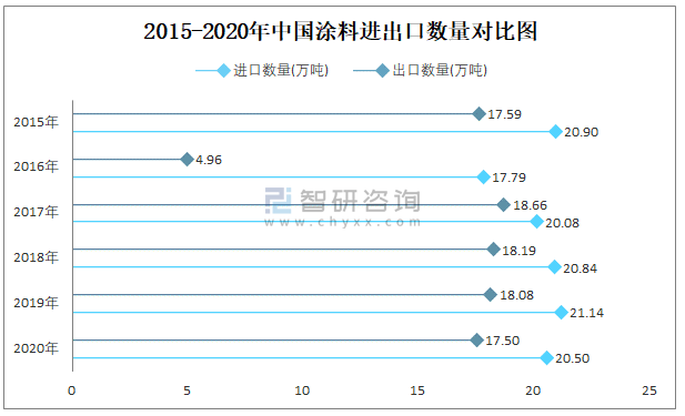 2015-2020年中國涂料進出口數(shù)量對比統(tǒng)計圖