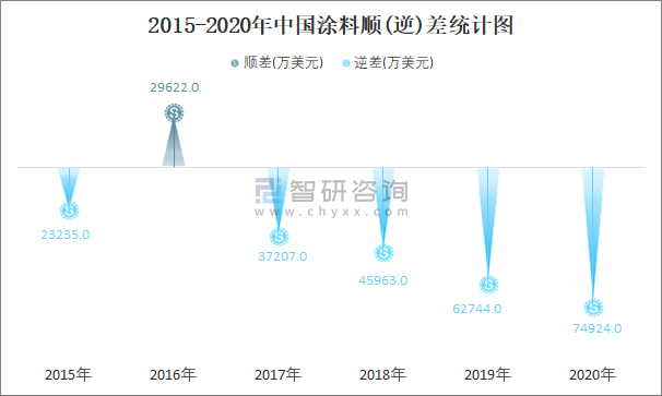 2015-2020年中國涂料順(逆)差統(tǒng)計圖
