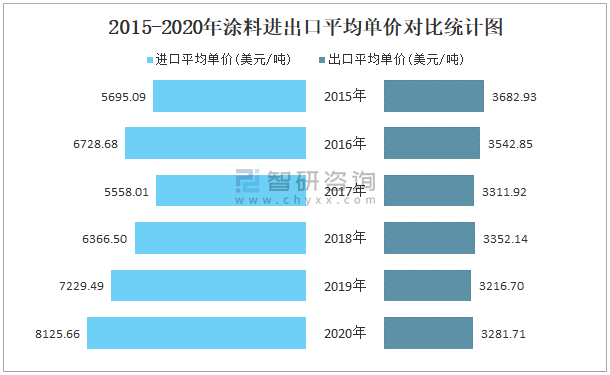 2015-2020年涂料進出口平均單價對比統(tǒng)計圖