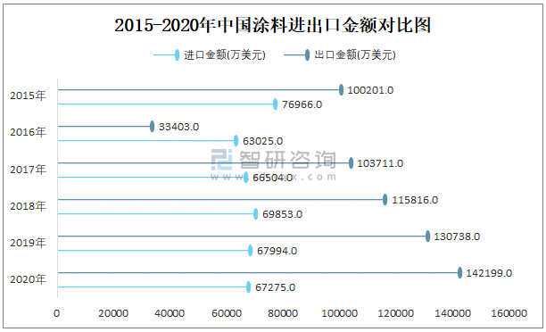 2015-2020年中國涂料進出口金額對比統(tǒng)計圖