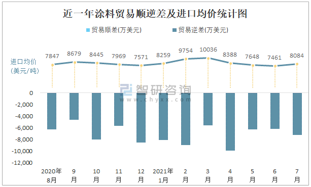 近一年涂料貿(mào)易順逆差及進口均價統(tǒng)計圖