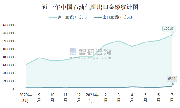 根據(jù)中國石油和化學(xué)工業(yè)聯(lián)合會數(shù)據(jù)顯示:2021年7月中國石油氣進(jìn)口數(shù)量為239萬噸,出口數(shù)量為11萬噸;進(jìn)口金額為135104萬美元,出口金額為6514萬美元;近一年中國石油氣出口總金額小于進(jìn)口總金額,貿(mào)易逆差為主,7月進(jìn)口均價565.3美元/噸。