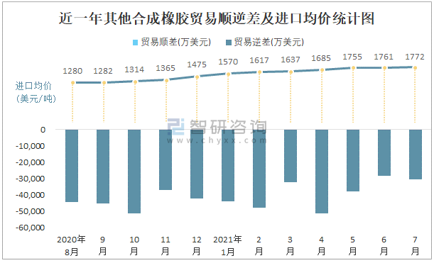 近一年其他合成橡膠貿(mào)易順逆差及進(jìn)口均價(jià)統(tǒng)計(jì)圖