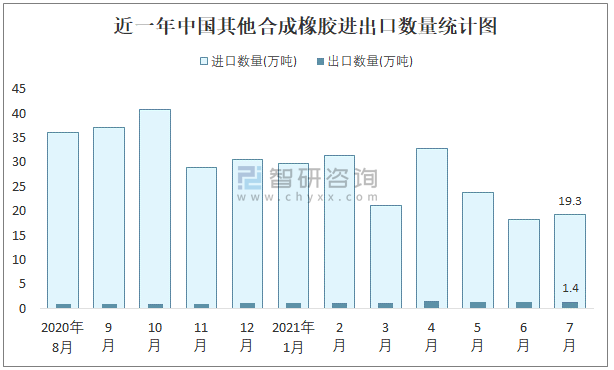 2021年7月中國(guó)其他合成橡膠進(jìn)出口數(shù)量分別為19.3萬(wàn)噸和1.4萬(wàn)噸