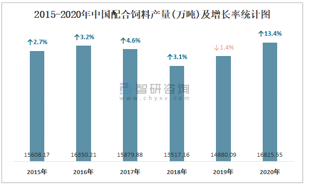 2015-2020年中國配合飼料產量及增長率統計圖