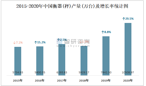 2015-2020年中國衡器(秤)產(chǎn)量及增長率統(tǒng)計圖