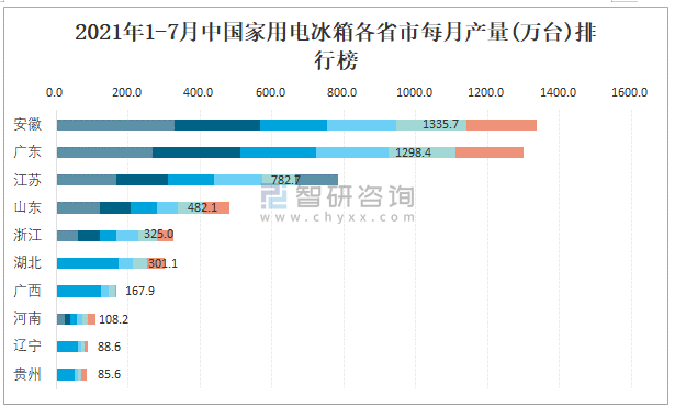 2021年1-7月中國家用電冰箱各省市每月產(chǎn)量排行榜