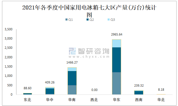 2021年各季度中國家用電冰箱七大區(qū)產(chǎn)量統(tǒng)計圖