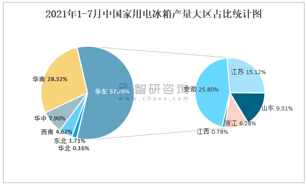 2021年1-7月中國家用電冰箱產(chǎn)量大區(qū)占比統(tǒng)計圖