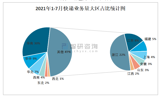 2021年1-7月快遞業(yè)務(wù)量大區(qū)占比統(tǒng)計圖