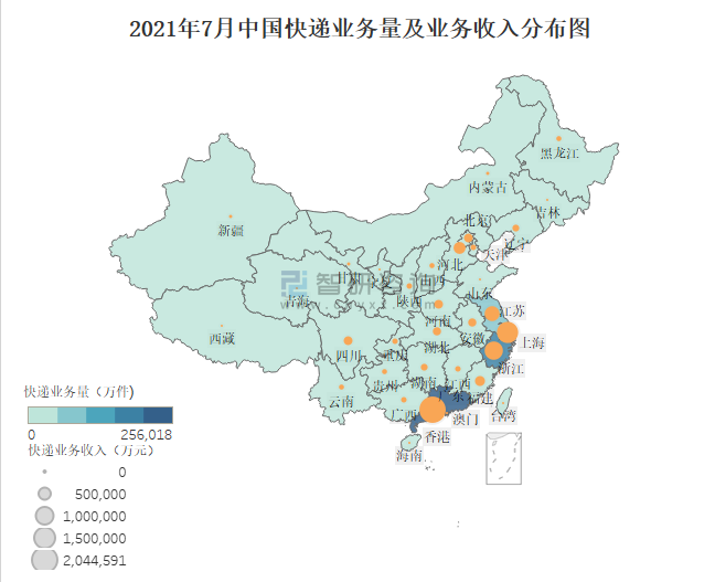 2021年7月中國快遞業(yè)務(wù)量及業(yè)務(wù)收入分布圖