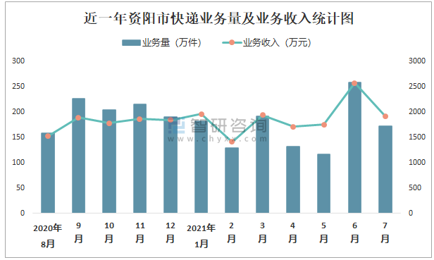根據各省市郵政局數據可知:2021年7月資陽市快遞業務量為171.93萬件,業務收入為1920.62萬元;2021年1-7月資陽市快遞累計業務量為1181.66萬件,同比增長-16.79%,累計業務收入為13276.34萬元,同比增長3.55%;2019-2020年資陽市快遞業務量呈下降趨勢,業務收入呈上升趨勢。