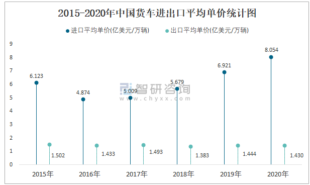 2015-2020年中國(guó)貨車進(jìn)出口平均單價(jià)統(tǒng)計(jì)圖