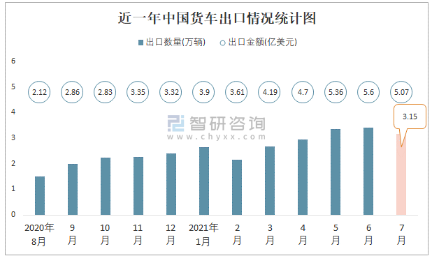 根據(jù)中國(guó)海關(guān)數(shù)據(jù)顯示:2021年7月中國(guó)貨車進(jìn)口數(shù)量為0.05萬(wàn)輛,同比下降48.2%,進(jìn)口金額為0.46億美元,同比下降50%,2021年7月中國(guó)貨車出口數(shù)量為3.15萬(wàn)輛,同比增長(zhǎng)121.2%,出口金額為5.07億美元,同比增長(zhǎng)126.8%;2021年1-7月中國(guó)貨車進(jìn)口數(shù)量為0.4萬(wàn)輛,進(jìn)口金額為3.57億美元,出口數(shù)量為20.32萬(wàn)輛,出口金額為32.42億美元。