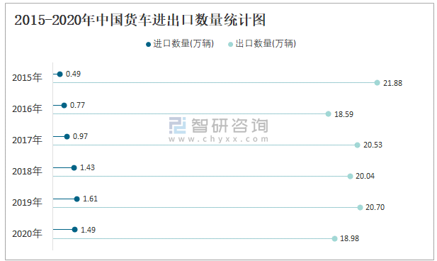2015-2020年中國(guó)貨車進(jìn)出口數(shù)量統(tǒng)計(jì)圖