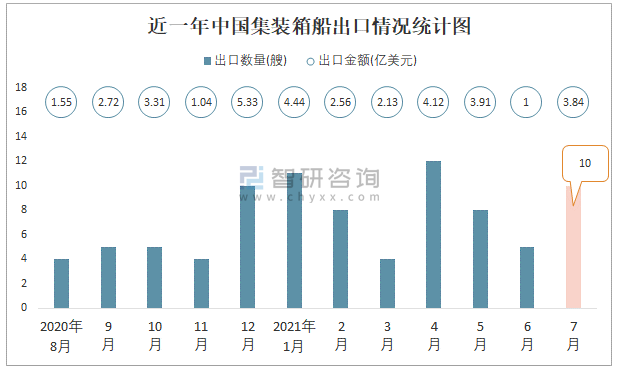 根據中國海關數據顯示:2021年7月中國集裝箱船出口數量為10艘,同比增長100%,出口金額為3.84億美元,同比增長85.9%;2021年1-7月中國集裝箱船,出口數量為58艘,出口金額為22億美元。
