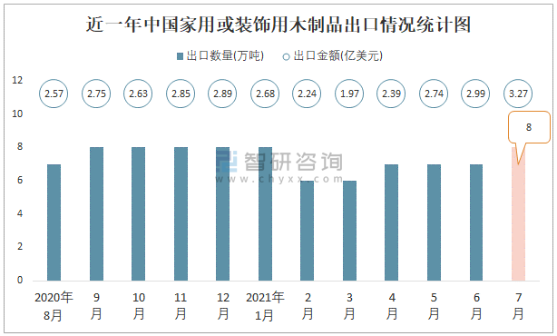 根據(jù)中國海關(guān)數(shù)據(jù)顯示:2021年7月中國家用或裝飾用木制品出口數(shù)量為8萬噸,同比增長(zhǎng)8.8%,出口金額為3.27億美元,同比增長(zhǎng)19.6%;2021年1-7月中國家用或裝飾用木制品,出口數(shù)量為48萬噸,出口金額為18.28億美元。
