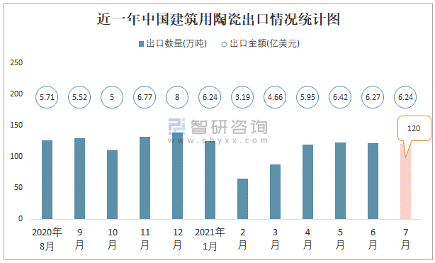 根據(jù)中國海關數(shù)據(jù)顯示:2021年7月中國建筑用陶瓷出口數(shù)量為120萬噸,同比下降4.3%,出口金額為6.24億美元,同比下降5.6%;2021年1-7月中國建筑用陶瓷,出口數(shù)量為761萬噸,出口金額為38.92億美元。