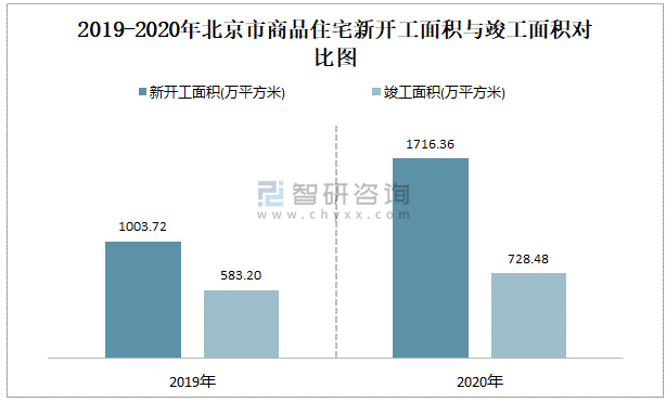 2019-2020年北京市商品住宅新開工面積與竣工面積對比圖
