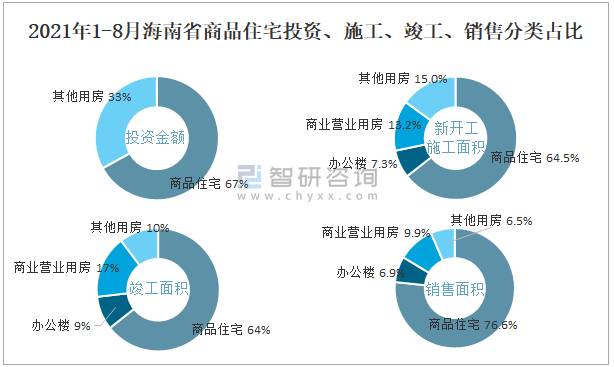 2021年1-8月海南省商品住宅投資、施工、竣工、銷售分類占比