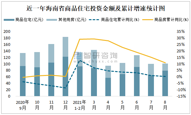 近一年海南省商品住宅投資金額及累計增速統(tǒng)計圖
