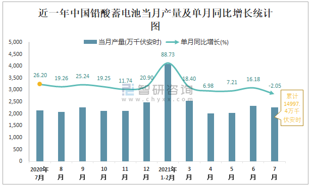 根據國家統計局數據顯示:2021年7月中國鉛酸蓄電池產量為2275萬千伏安時,同比下降2.05%;2021年1-7月中國鉛酸蓄電池累計產量為14997.4萬千伏安時,同比增長17.31%;2015-2020年中國鉛酸蓄電池產量2018年達跌至最低,此后逐年遞增。