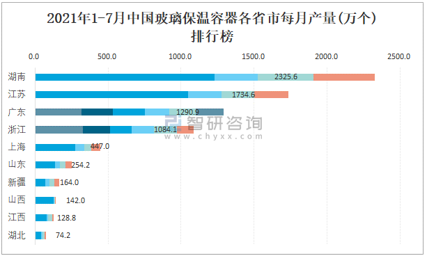 2021年1-7月中國玻璃保溫容器各省市每月產量排行榜