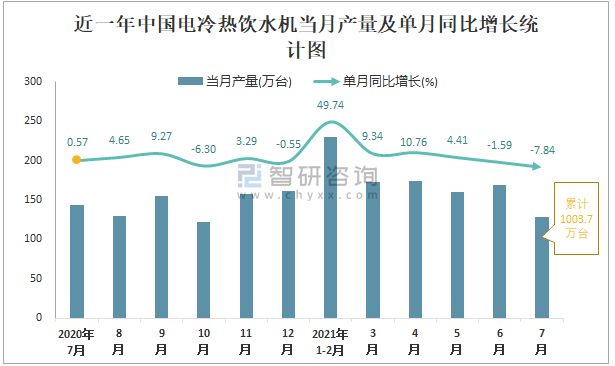 根據國家統計局數據顯示:2021年7月中國電冷熱飲水機產量為128萬臺,同比下降7.84%;2021年1-7月中國電冷熱飲水機累計產量為1003.7萬臺,同比增長16.19%;2015-2020年中國電冷熱飲水機產量總體呈現下降趨勢。