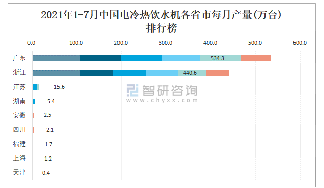 2021年1-7月中國電冷熱飲水機各省市每月產量排行榜