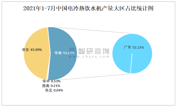 2021年1-7月中國電冷熱飲水機產量大區占比統計圖