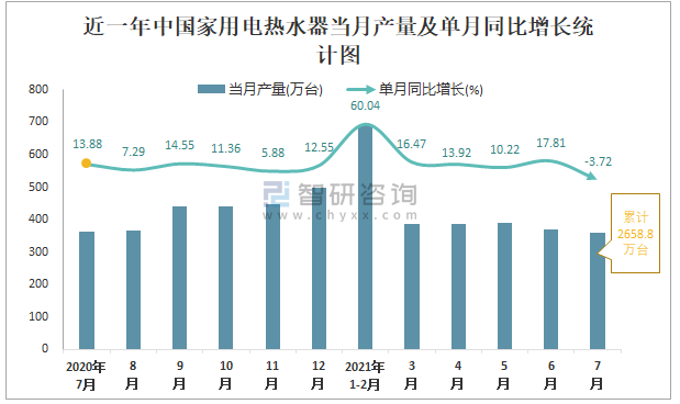 根據國家統計局數據顯示:2021年7月中國家用電熱水器產量為361萬臺,同比下降3.72%;2021年1-7月中國家用電熱水器累計產量為2658.8萬臺,同比增長17.95%;2015-2020年中國家用電熱水器產量2019年達到最高,次年大幅度下滑。