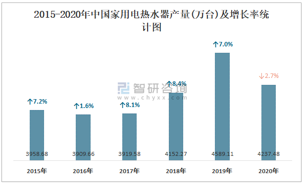 2015-2020年中國家用電熱水器產量及增長率統計圖