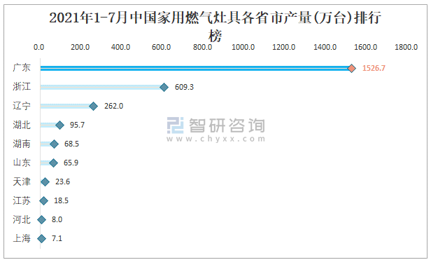 2021年1-7月中國家用燃?xì)庠罹吒魇∈挟a(chǎn)量排行榜