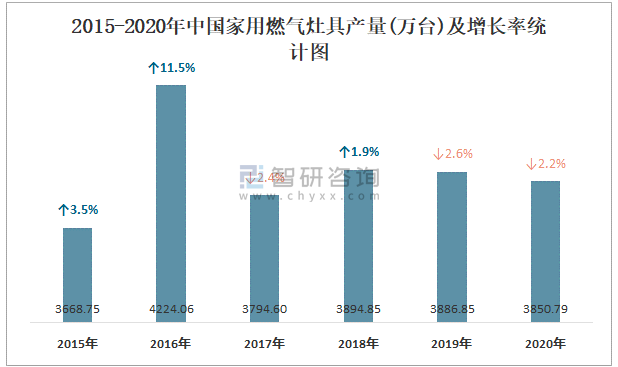 2015-2020年中國家用燃?xì)庠罹弋a(chǎn)量及增長率統(tǒng)計(jì)圖