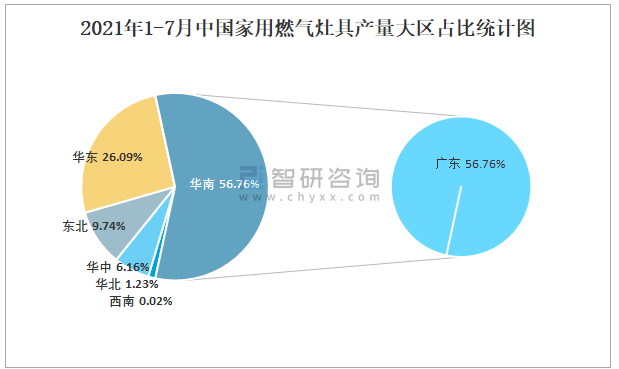 2021年1-7月中國家用燃?xì)庠罹弋a(chǎn)量大區(qū)占比統(tǒng)計(jì)圖