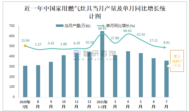 根據(jù)國家統(tǒng)計(jì)局?jǐn)?shù)據(jù)顯示:2021年7月中國家用燃?xì)庠罹弋a(chǎn)量為359萬臺,同比增長8.91%;2021年1-7月中國家用燃?xì)庠罹呃塾?jì)產(chǎn)量為2689.7萬臺,同比增長38.53%;2015-2020年中國家用燃?xì)庠罹弋a(chǎn)量2016年達(dá)到最高,此后總體呈現(xiàn)下降趨勢。
