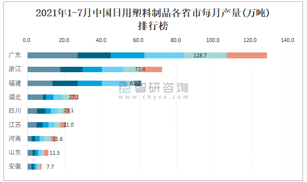 根據國家統計局數據顯示:2021年各季度(第三季度暫只統計7月數據)中國日用塑料制品主要集中在華東、華南、華中地區生產;2021年1-7月中國日用塑料制品產量大區分布不均衡,其中華東地區產量最高,特別是浙江省貢獻了最多產量;2021年1-7月中國日用塑料制品各省產量top1遙遙領先于其他前9名,廣東、浙江、福建等省產量最多。