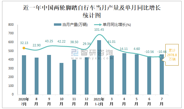 根據國家統計局數據顯示:2021年7月中國兩輪腳踏自行車產量為460萬輛,同比下降10.46%;2021年1-7月中國兩輪腳踏自行車累計產量為2978.8萬輛,同比增長13.31%;2015-2020年中國兩輪腳踏自行車產量2019年跌至最低,次年有所回升。