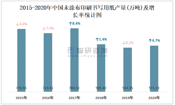 2015-2020年中國未涂布印刷書寫用紙產(chǎn)量及增長率統(tǒng)計圖