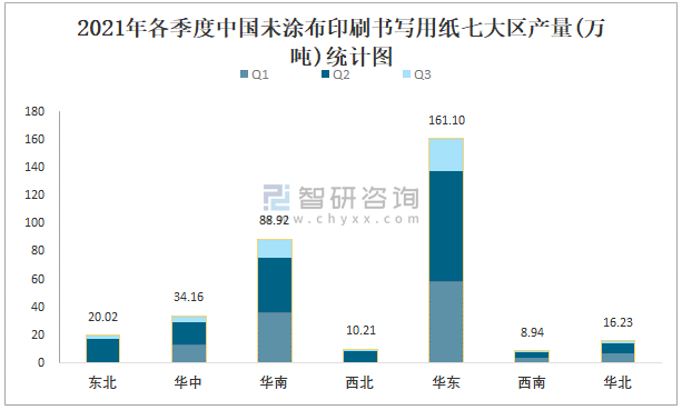 2021年各季度中國未涂布印刷書寫用紙七大區(qū)產(chǎn)量統(tǒng)計圖