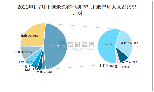 2021年1-7月中國未涂布印刷書寫用紙產(chǎn)量大區(qū)占比統(tǒng)計圖