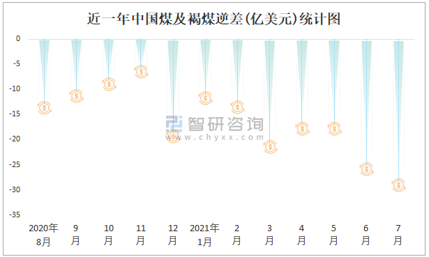近一年中國(guó)煤及褐煤逆差(億美元)統(tǒng)計(jì)圖