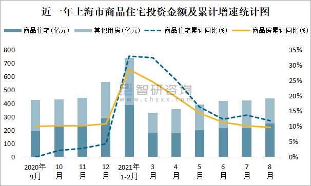 根據國家統計局數據統計可知:2021年8月上海市房地產開發投資商品房投資金額為440.62億元(其中商品住宅為252.09億元,辦公樓、商業營業用房等其他用房188.53億元);2021年1-8月上海市房地產開發投資商品住宅累計投資金額為1636億元,投資金額累計同比增長11.9%。