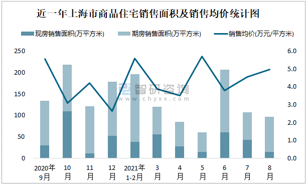近一年上海市商品住宅銷售面積及銷售均價統計圖
