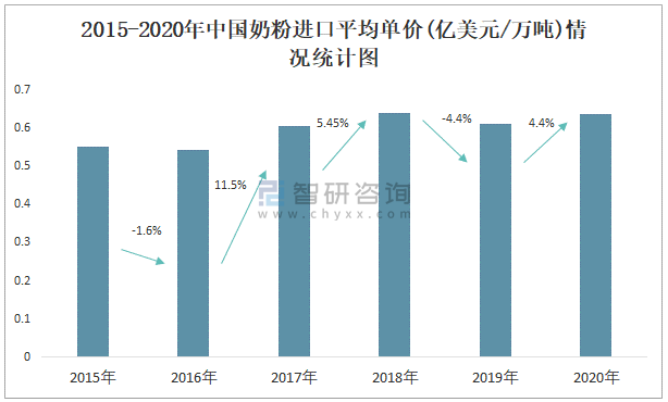 2015-2020年中國奶粉進口平均單價(億美元/萬噸)情況統計圖