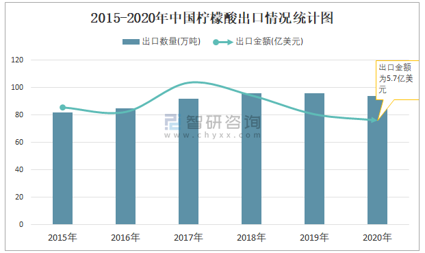 2015-2020年中國檸檬酸出口情況統計圖