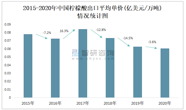 2015-2020年中國檸檬酸出口平均單價(億美元/萬噸)情況統計圖