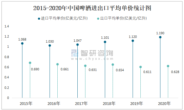 2015-2020年中國(guó)啤酒進(jìn)出口平均單價(jià)統(tǒng)計(jì)圖