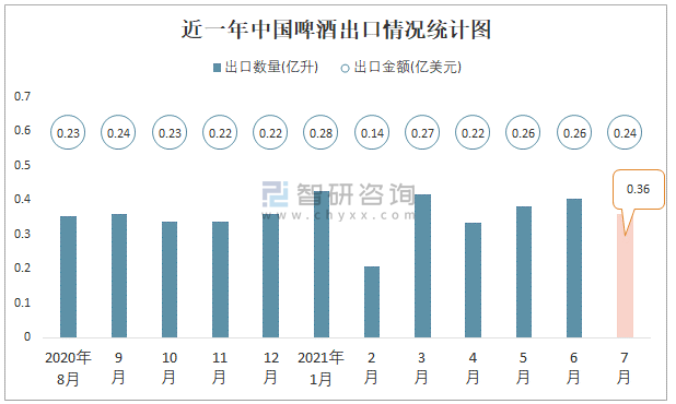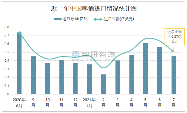 根據(jù)中國(guó)海關(guān)數(shù)據(jù)顯示:2021年7月中國(guó)啤酒進(jìn)口數(shù)量為0.45億升,同比下降29.4%,進(jìn)口金額為0.57億美元,同比下降20.6%,2021年7月中國(guó)啤酒出口數(shù)量為0.36億升,同比增長(zhǎng)4.2%,出口金額為0.24億美元,同比增長(zhǎng)6.1%;2021年1-7月中國(guó)啤酒進(jìn)口數(shù)量為3.1億升,進(jìn)口金額為4.02億美元,出口數(shù)量為2.53億升,出口金額為1.67億美元。
