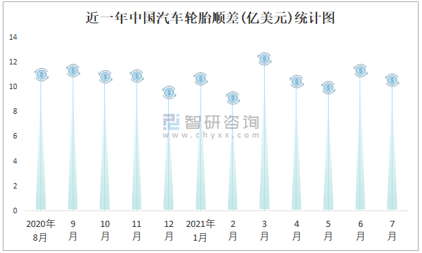 近一年中國汽車輪胎順差(億美元)統(tǒng)計圖
